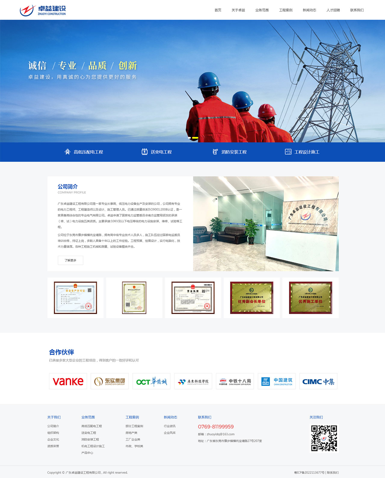 廣東卓益建設工程有限公司是一家專業從事高、低壓電力設備生產及安裝的公司,公司擁有專業的電力工程師、工程建造師以及設計、施工管理人員。已通過質量體系 1SO9001 : 2008 認證,是一家具備高綜合性的專業電氣有限公司。卓益申取了國家電力監管委員會南方監管局頒發的承裝(修、試)電力設施五類資質。主要承接:10KV及以下電壓等級的電力設施安裝、維修、試驗等工程。